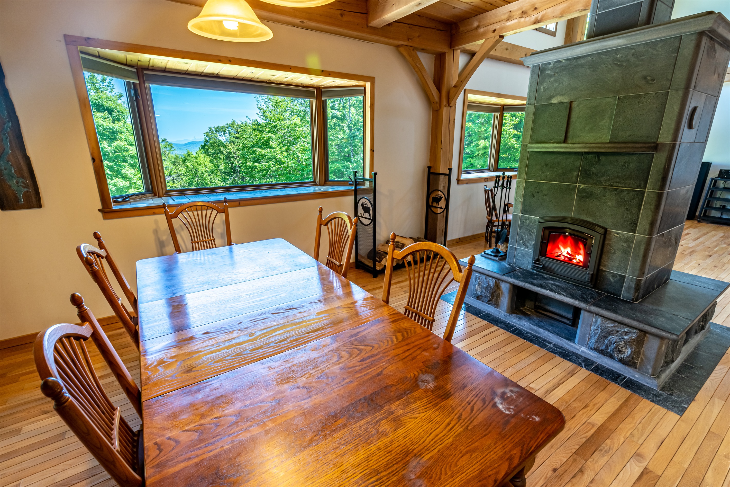 - Living Room: Soaring windows frame breathtaking mountain views. Enjoy fireside chats by the double-sided wood fireplace shared with the dining room.
