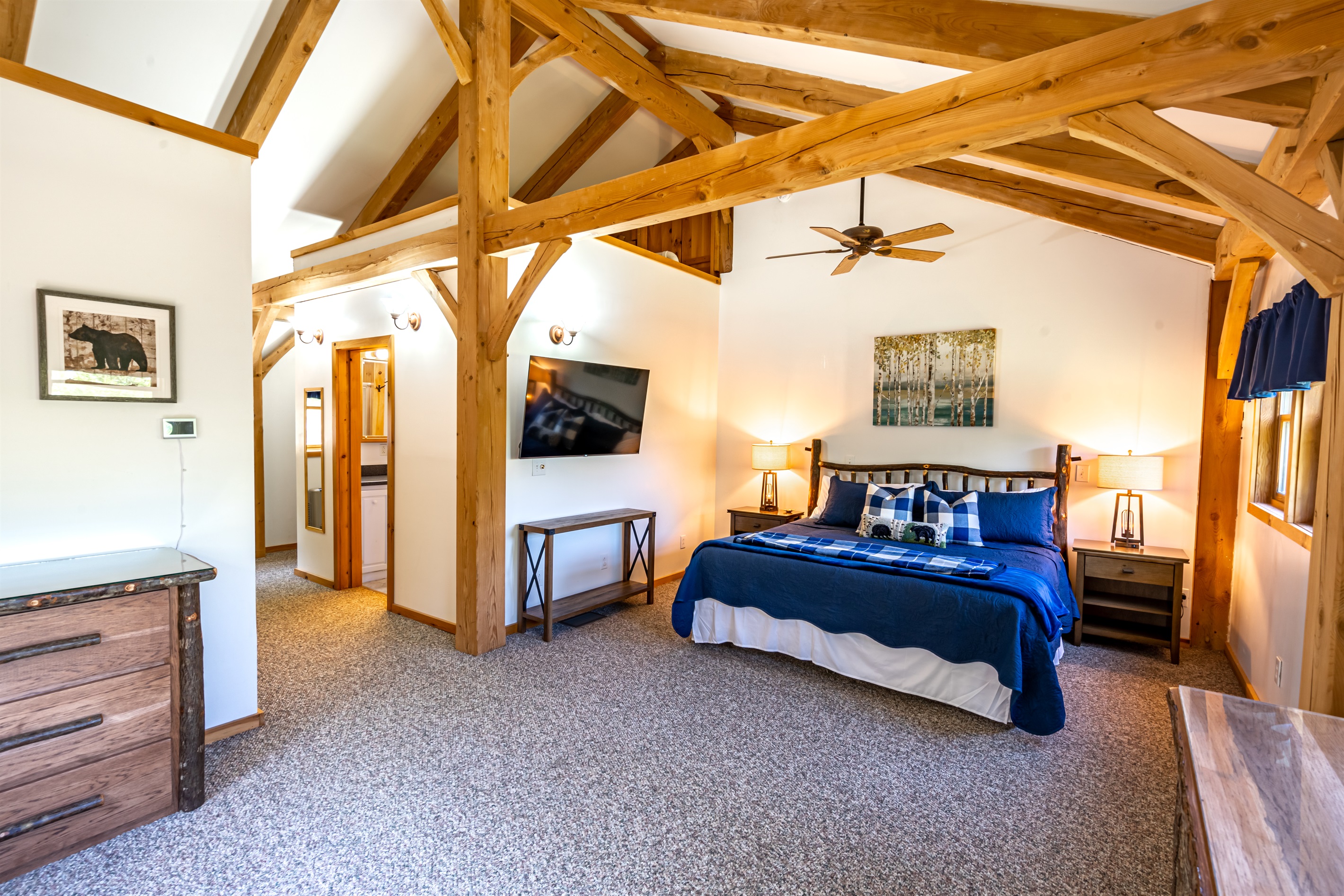 - Primary Suite: King bed, ensuite bathroom, smart TV, and stunning mountain views.